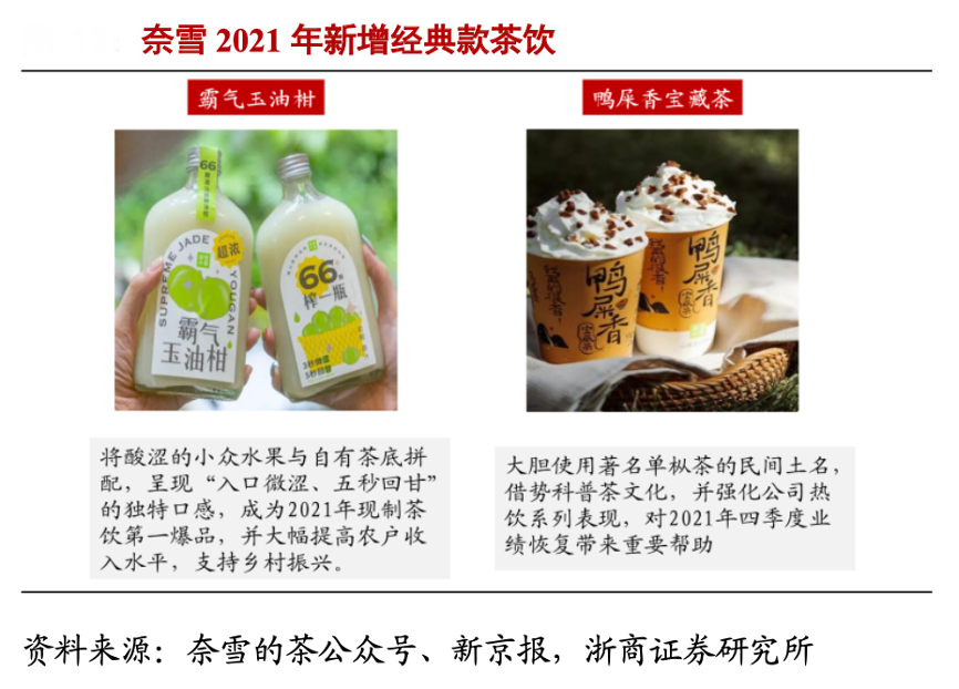 經(jīng)典案例:根據(jù)奈雪的茶公眾號(hào)、新京報(bào)、浙商證券研究所等綜合資訊表明,奈雪通過(guò)高頻高質(zhì)量的季節(jié)款上新,不斷迭代升 級(jí)核心菜單。以 2021 年奈雪推出的油柑、鴨屎香寶系列爆款產(chǎn)品為例,基于穩(wěn)定的熱度和較高的復(fù)購(gòu)率,公司已將其轉(zhuǎn)到經(jīng)典產(chǎn)品線,為奈雪持續(xù)成長(zhǎng)貢獻(xiàn)營(yíng)收。奈雪通過(guò)自研的信息平臺(tái)Teacore收集客戶喜好和需求,而高頻高質(zhì)的上新極大加快了獲取訂單信息和消費(fèi)者直觀需求的速度。