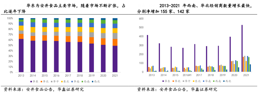 經(jīng)典案例:根據(jù)安井食品公告、華鑫證券研究等綜合資訊表明,安井食品公司以華東為中心,逐步開拓東北、華南、西南、西北等非強(qiáng)勢(shì)區(qū)域,構(gòu)建高密度銷售網(wǎng)絡(luò)。2013-2021年其西南、華北經(jīng)銷商數(shù)量增長最快,分別凈增加155家、142家。