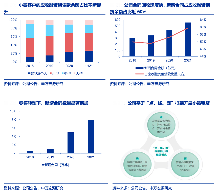 經典案例:根據公司公告、申萬宏源研究等綜合資訊表明,江蘇租賃公司不斷加強微型及個人客戶、小型客戶的開發,微型及個人客戶、小型客戶的應收租賃款余額從 2018 年末的 332 億元大幅上升至 1H21 的 642 億元,增長近翻倍,余額占比也從 2018 年末的 57.3% 上升至 2021 年 6 月末的 69.4%。2021 公司小微客戶數 4.5 萬個,同比增 74%;小微客 戶投放金額 265 億元,同比增 31%。差異化定位與商業銀行、大型銀行系金租等形成錯位競爭,“大批量、小金額”的零售金融特征逐步顯現。