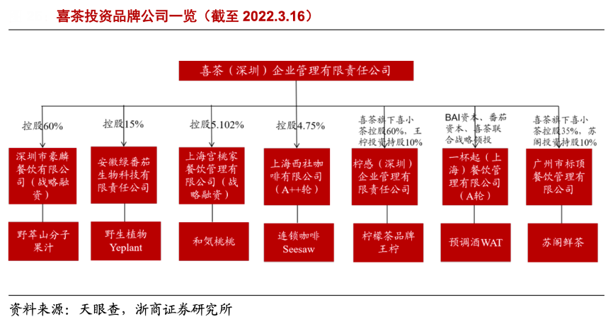 經典案例:根據天眼查、浙商證券研究所等綜合資訊表明,結合喜茶 GO 小程序,喜茶已布局咖啡、雪糕、甜點烘焙多條產品線,據天眼查數據,2021 年 7 月以來,喜茶投資了包括精品咖啡Seesaw、檸檬茶品牌王檸、水果茶品牌和気桃桃、果汁品牌野萃山、燕麥奶品牌野生植物 YePlant、預調酒品牌 WAT 共 6 個品牌,2022 年喜茶又投資了中端價位主打水果茶的蘇閣鮮茶,產品線持續拓展。