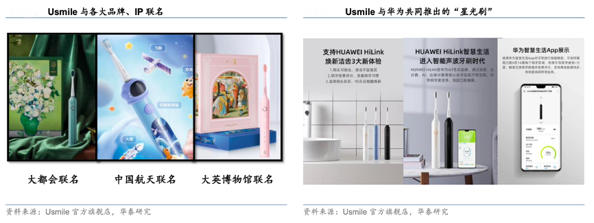2021 年 10 月, Usmile 接入華為 1+N+8 的戰略合作,聯合發布新品“星光刷”,其內部植入藍牙芯片,接入華為的 Hilink 生態系統,實現刷牙的智能化、可視化,指引用戶優化刷牙方法。