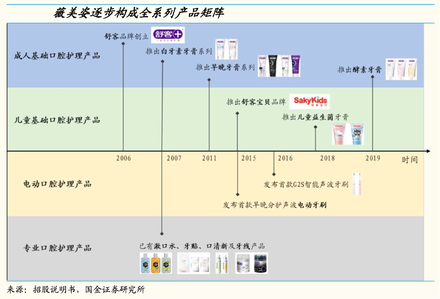 經典案例:根據招股說明書、國金證券研究所等綜合資訊表明,薇美姿公司在面對外資品牌&渠道強勢的牙膏賽道,積極做基礎牙膏賽道的產品創新升級,先后推出白牙素、酵素牙膏等。在產品線布局方面,此外除基礎產品牙膏牙刷外,最早于 2007 年開始前瞻性布局牙貼、口清新、漱口水、牙線、等一系列產品。2015 年推出兒童品牌舒客寶貝,同年發布首款聲波電動牙刷。