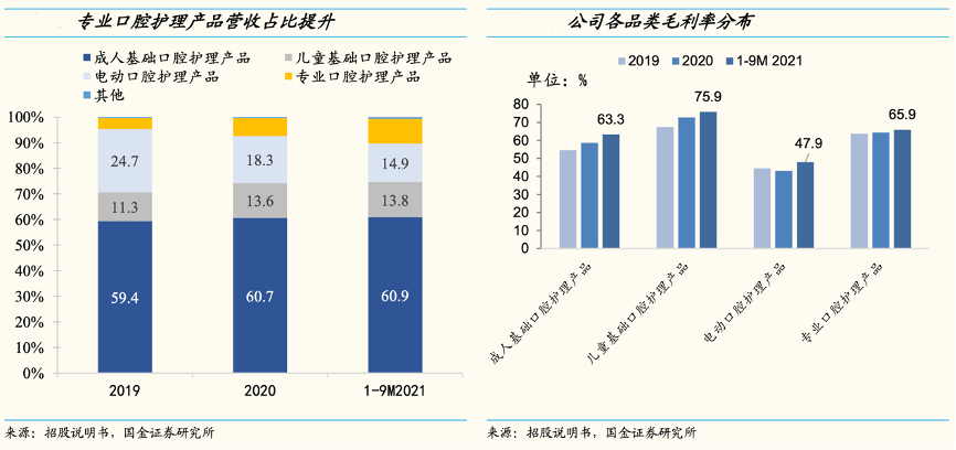 經典案例:根據招股說明書、國金證券研究所等綜合資訊表明,薇美姿以牙膏&牙刷基礎護理為基,電動、專業護理多點開花。2021年前三季度,公司成人、兒童基礎口腔護理產品(以牙膏&牙刷為主)營收分別達 7.5/1.7 億元,同比增長 18.5%/12.2%。電動口腔護理產品營收連續下降,專業口腔護理產品營收年均增速60%。