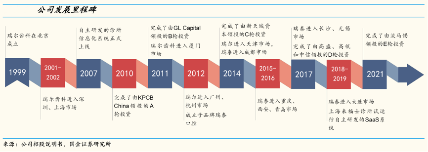 經(jīng)典案例:根據(jù)公司招股說明書、國金證券研究所等綜合資訊表明,1999 年 4 月,瑞爾齒科創(chuàng)始人鄒其芳先生創(chuàng)建了北京第一家國內(nèi)高端口腔診所,定位高端人群。2012年,公司推出第二品牌瑞泰口腔,服務(wù)于國內(nèi)的中端人群,公司也從前 1999 年-2010 年的學(xué)習(xí)積累期,進(jìn)入了 2012 年至今的快速發(fā)展期。