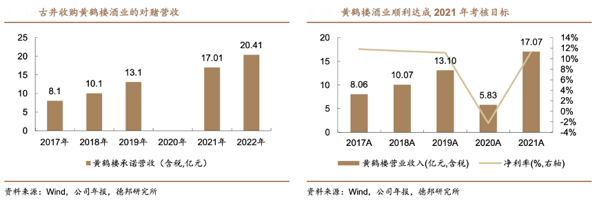經典案例:根據wind、公司年報和德邦研究所等綜合資訊表明,黃鶴樓在 1984 年/1989 年兩度獲得名酒稱號,古井 2016 年以 8.16 億元收購黃鶴樓 51%股權進入湖北市場,在雙品牌戰略下開啟全國化,并在產品、渠道、品牌、組織架構等方 面進行優化:一方面加大黃鶴樓品宣力度;另一方面古井向黃鶴樓派駐管理團隊,嫁接古井優秀的渠道運作模式。