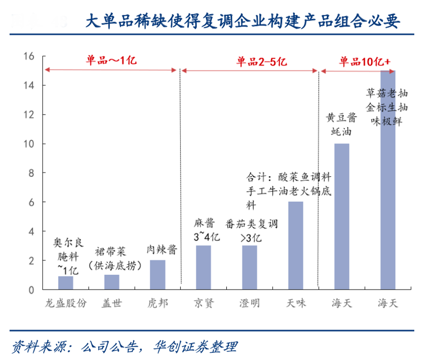 經典案例:根據公司公告、華創證券等綜合資訊表明,與基礎調味料不同,復調更貼近餐飲和服務,本身大單品稀缺,除底料頤海與辣醬老干媽外,行業 內在 2-5 億的單品較少,大部分集中在 1 億以下,使得構建產品組合與拓品類非常關鍵。