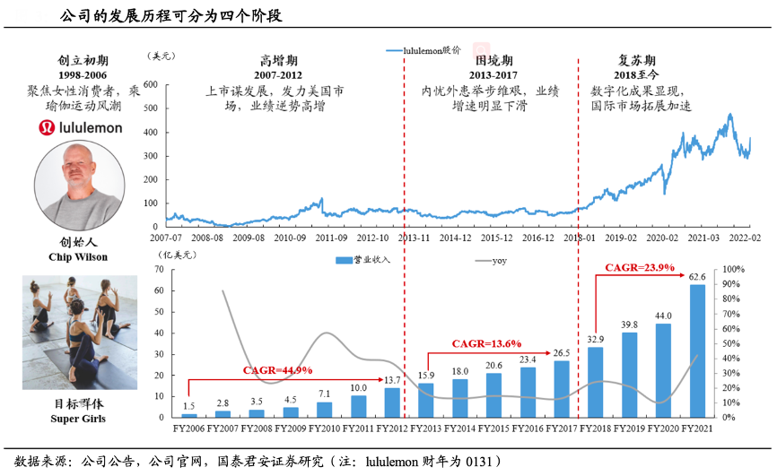 經典案例:根據公司公告、公司官網、國泰君安證券研究等綜合資訊表明,回顧 lululemon 二十余年的發展歷程,大致可分為創立初期、高增期、困境期及復蘇期等四個階段。