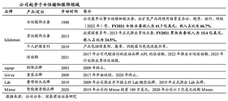 經典案例:根據公司公告、國泰君安證券研究等綜合資訊表明,露露樂蒙于1998 年在北美成立,以售賣女性瑜伽服起家,目前是全球知名的運動休閑品牌商、瑜伽領域龍頭。主品牌 lululemon 的業務從女性服飾拓展至男性服飾、個人護理及運動鞋領域,產品使用場景囊括瑜伽、跑步、網球、辦公及旅行等。此外,公司還通過自我孵化及收購方式擁有奢侈高街品牌 Lab 及智能健身鏡品牌 Mirror。