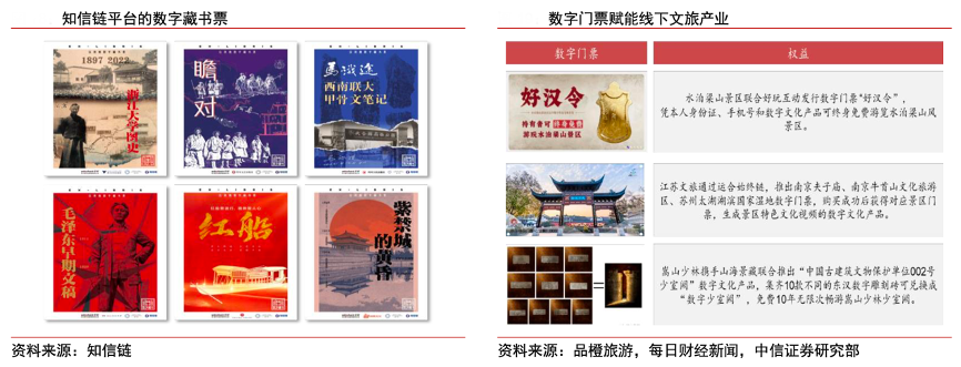 經典案例:根據知信鏈、品橙旅游、每日財經新聞、中信證券研究部等綜合資訊表明,數字文化產品的應用不僅僅是實體文化產品的數字復制衍生,更是連接虛擬與現實世界的紐帶。例如,2022 年 4 月,國家新聞出版署等部門牽頭,聯合 30 余家出版單位推出“數字藏書”項目,通過“實體圖書+數字藏書票”的形式,實現圖書發行創新;6月份,江蘇文旅發行南京夫子廟、南京 牛首山、蘇州太湖等數字藏品門票,將文旅紀念品、數字文化產品和景區門票三種產品相結合,探索文旅前沿。