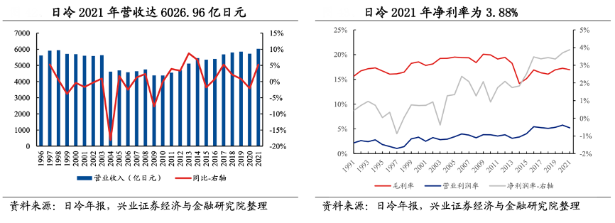 經典案例:根據日冷年報、興業證券經濟與金融研究院等綜合資訊表明,日冷集團以海產品起家,逐漸發展成為日本預制菜龍頭企業。日冷 2021 年營業總 收入達 6026.96 億日元(約 313.19 億 RMB),過去 10 年 CAGR 為2.85%,2021 年凈利率 3.88%。其擁有日冷食品(調理食品)、日冷物流(冷鏈物流)、日冷生鮮(海產品和畜禽產品)等主要子公司,形成了全產業鏈布局。