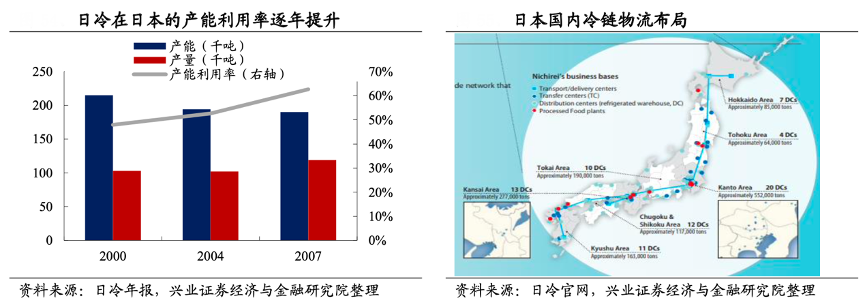 經(jīng)典案例:根據(jù)日冷年報(bào)、日冷官網(wǎng)、興業(yè)證券經(jīng)濟(jì)與金融研究院等綜合資訊表明,日冷旗下有食品、物流生鮮三大子公司,從原料采購(gòu)、加工、配送倉(cāng)儲(chǔ)均具備協(xié)同作用。上游來(lái)看,日本通過(guò)全球子公司,從 30 多個(gè)國(guó)家進(jìn)口高質(zhì)量食材,同時(shí)自有19個(gè)工廠(15個(gè)在日本,2 個(gè)在泰國(guó),2 個(gè)分別在中國(guó)和巴西),并加強(qiáng)冷鏈物流建設(shè),日冷物流已在 12 個(gè)國(guó)家擁有 42 個(gè)基地,已擁有近 8000 輛冷鏈運(yùn)輸車(chē),全球合計(jì) 207.4 萬(wàn) 噸冷藏倉(cāng)儲(chǔ)能力,冷鏈布局排名日本第一(占 9%份額),世界第六。