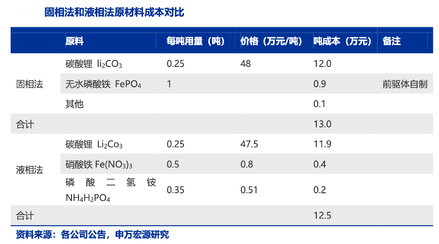 經典案例:根據各公司公告、申萬宏源研究等綜合資訊表明,液相法單噸具有 5000 元左右的成本節省優勢:對原材料雜質要求低,可以使用較高比例的工業級碳酸鋰,而固相法主要使用電池級別碳酸鋰,按照原材料價格高位計算,固相法單噸成本在 13 萬元左右,而液相法在 12.5 萬元左右。此外在能量消耗上,液相法熱處理溫度相對較低,比如德方納米采用液相法,燒結溫度 650-680°C, 低于固相法的 700-730°C,因此能耗成本略低。
