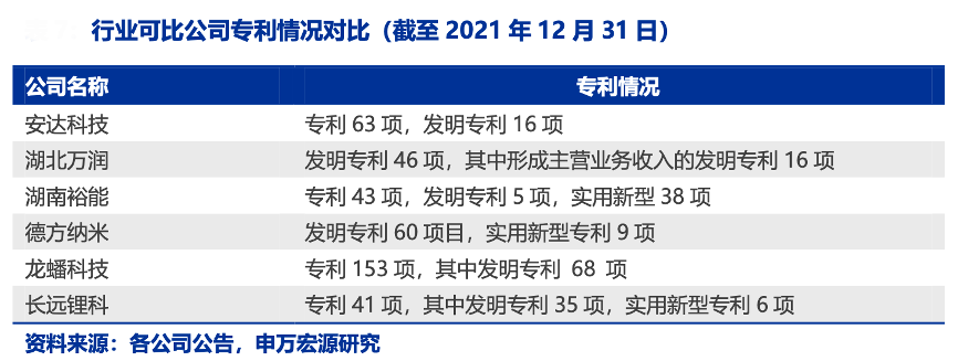 經典案例:根據各公司公告、申萬宏源研究等綜合資訊表明,安達科技公司 2011 年引入比亞迪技術團隊,19 年做技改時比亞迪繼續指導公司做技改,經過 10 多年耕耘,多項技術指標達到國家先進水平,共取得專利 63 項,其中發明專利 16 項。在磷酸鐵鋰領域,其與湖北萬潤發明專 利數相同、比湖南裕能專利數量多,研發能力處于行業前列。