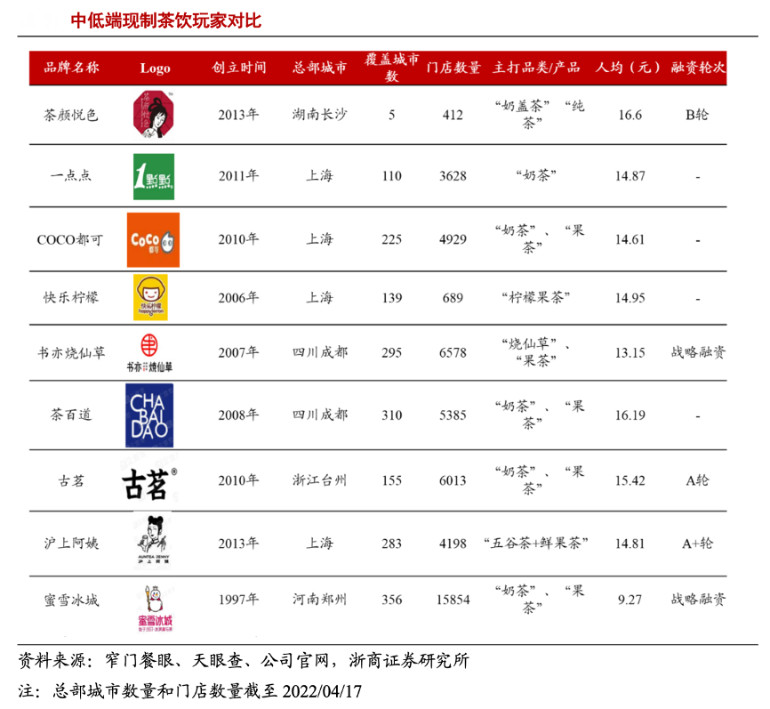 經典案例:根據窄門餐眼、天眼查、公司官網、浙商證券研究所等綜合資訊表明,結合灼識咨詢資訊,2020年低端/中端茶飲占比約為 32%/49%,中低端合計占比約81%,同時根據奈雪的茶招股書,2020 年零售額市占率排名前五的中低端茶飲品牌分別是蜜雪冰城、CoCo都可、書亦燒仙草、古茗和一點點,CR2 約為 24.9%,CR5 約為51.2%,低端茶飲市場集中度偏低,且不斷有新品牌涌現,尚未跑出絕對龍頭,高端品牌正嘗試通過價格帶下沉搶占市場。