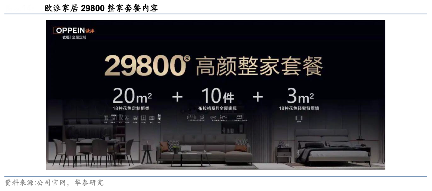 經典案例:根據公司官網、華泰研究等綜合資訊表明,歐派作為行業內大家居戰略拓荒者,在品類拓展端一直走在行業前列,2021 年 9 月,公司在行業內率先推出 29800 高顏整家定制解決 方案,該套餐包含 20 平方米的輕奢流行色定制柜(18 個花色),布拉格系列沙發+貴妃位、 餐桌椅(一桌四椅)、茶幾、皮床、床墊,以及 3 平米的背景墻(18 個花色)。