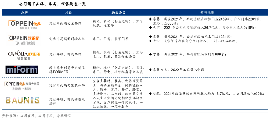 產品方面,公司產品體系涵蓋定制廚柜、定制衣柜、衛浴、木門、金屬門窗、裝甲門、廚電、軟 裝配飾等全品類;品牌方面,公司旗下擁有歐派、歐鉑尼、歐鉑麗、Miform、鉑尼思等全品牌矩陣。