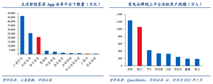 經典案例:根據七麥數據、QuestMobile、華創證券等綜合資訊表明,海爾系App能與三翼鳥實體店相互結合,推動智慧家庭場景落地,其用戶規模不斷提升。在主流智能家居 App 中僅安 卓平臺智家+三翼鳥下載量已達 2.1 億,僅次于中國電信旗下的小翼管家與美的美居。若對比家電品牌,則海爾線上月活用戶規模超過 1000 萬人,與美的用戶規模差距進一步縮小。