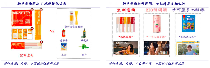 經(jīng)典案例:根據(jù)天貓、各公司官網(wǎng)、中國(guó)銀行證券研究院等綜合資訊表明,意面由于其產(chǎn)品屬性(面+醬)對(duì)食品的新鮮度要求較低,能夠較好地還原餐廳的口味與品質(zhì)。同時(shí),以往的意面大多類似于國(guó)內(nèi)的掛面,消費(fèi)者需要自己調(diào)制醬料,但國(guó)內(nèi)家庭廚房往往缺少西式調(diào)料,因此輕烹意面的出現(xiàn)可以解決這一需求痛點(diǎn)。