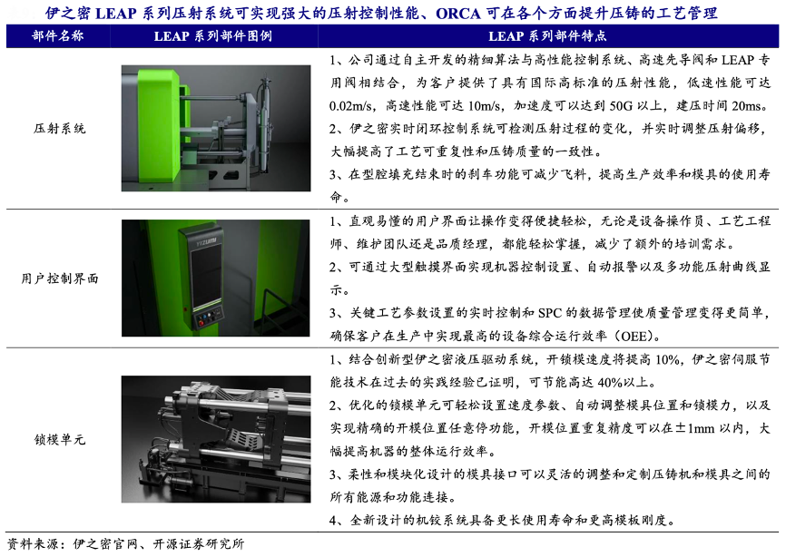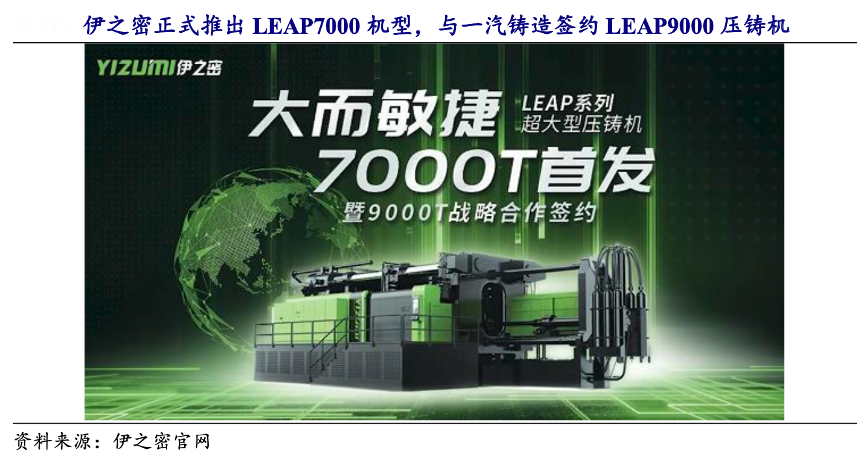 經典案例:根據伊之密官網、開源證券研究所等綜合資訊表明,2022 年,伊之密公司正式推出 LEAP7000 機型,該款產品采用高剛性、高效穩定的鎖模系統,可確保大型薄壁零件的高動態填充能力,更好地滿足新能源汽車超大型一體化壓鑄 件的工藝要求,同時公司與一汽鑄造簽約 LEAP9000 壓鑄機,此款壓 鑄機是為一汽新能源汽車的后地板超大型壓鑄件量身打造,外圍尺寸約為 1850X1500X800, 是目前市場上尺寸最大的壓鑄件。