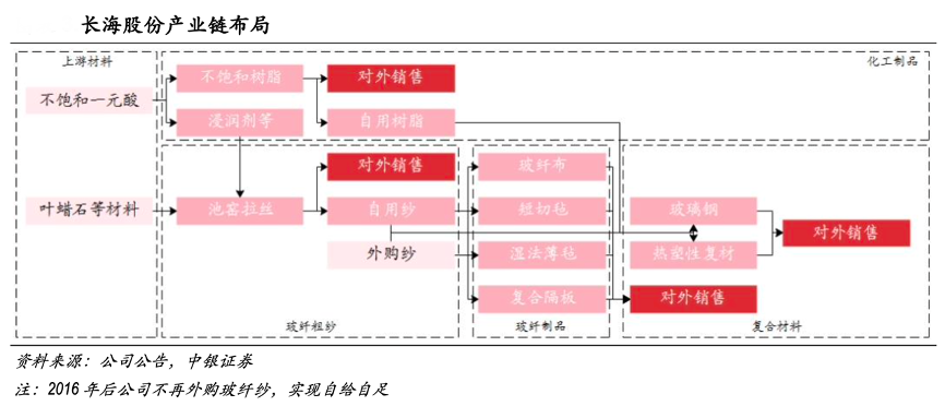 經(jīng)典案例:根據(jù)公司公告、中銀證券等綜合資訊表明,長(zhǎng)海股份公司主營(yíng)業(yè)務(wù)為玻璃纖維及制品以及化工制品,其與天馬集團(tuán)存在較強(qiáng)的協(xié)同效應(yīng),天馬集團(tuán)生產(chǎn)的樹脂和浸潤(rùn)劑是公司玻纖業(yè)務(wù)的重要原材料之一,而公司生產(chǎn)的短切氈、濕法薄氈 等玻纖制品在天馬集團(tuán)進(jìn)一步加工為玻纖復(fù)合材料。