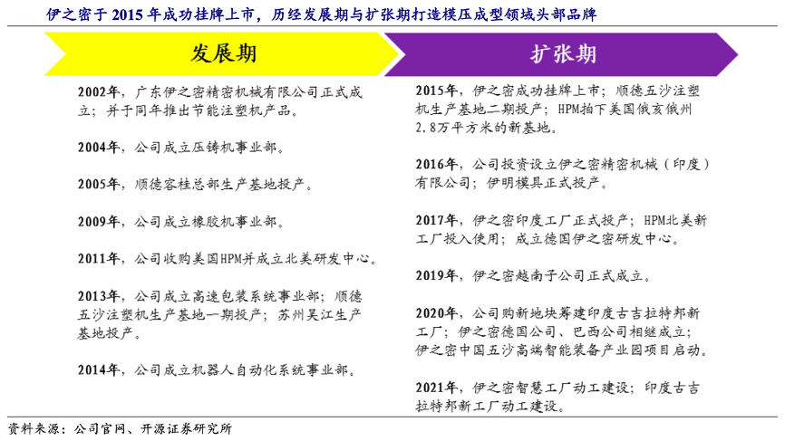 經(jīng)典案例:根據(jù)公司官網(wǎng)、開源證券研究所等綜合資訊表明,自伊之密公司于 2002 年成立以來(lái),始終專注于模壓成型專用機(jī)械設(shè)備的設(shè)計(jì)、研發(fā)、生產(chǎn)、銷售及服務(wù),能夠?yàn)榭蛻籼峁姆桨冈O(shè)計(jì)、產(chǎn)品制造到維修服務(wù)等全方位的個(gè)性化解決方案。其在國(guó)內(nèi)建有三大生產(chǎn)基地,并在全球范圍內(nèi)成立多家海外子公司,業(yè)務(wù)覆蓋數(shù)十個(gè)國(guó)家和地區(qū)。