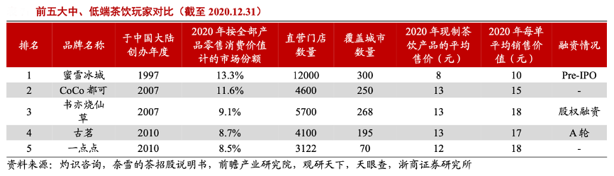 經典案例:根據灼識咨詢、奈雪的茶招股說明書、前瞻產業研究院、觀研天下、天眼查、浙商證券研究所等綜合資訊表明,低端茶飲市場集中度偏低,且不斷有新品牌涌現,尚未跑出絕對龍頭,高端品牌正嘗試通過價格帶下沉搶占市場。3月17日,奈雪的茶在官方公眾號發文,公司從 1 月開始已推出 9-19 元的“輕松系列”,在不改變原料品質的情況下每月上新單價在 20 元以下的新品。