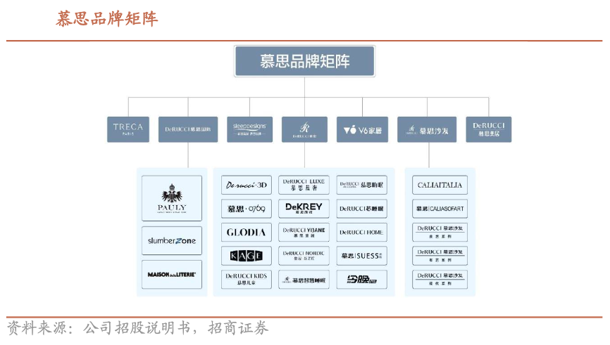 經(jīng)典案例:根據(jù)公司招股說明書、招商證券等綜合資訊表明,“慕思”已成為我國床墊行業(yè)的知名品牌,其目前已形成 7 大主力品牌,包括“慕思”、 “V6 家居”、“崔佧(TRECA)”、“慕思國際”、“思麗德賽(Sleep Designs)”、“慕思沙發(fā)”和“慕思美居”,構(gòu)建了完整的中高端及年輕時(shí)尚品牌矩陣,可滿足消費(fèi)者定制化的健康睡眠需求。