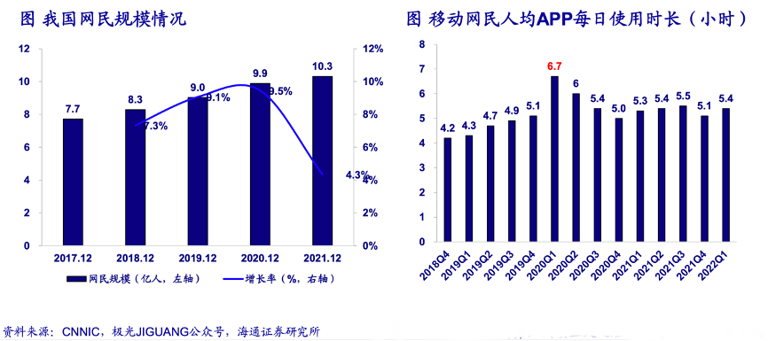 經(jīng)典案例:根據(jù)CNNIC、極光JIGUANG公眾號(hào)、海通證券研究所等綜合資訊表明,截至2021年12月底,我國(guó)網(wǎng)民數(shù)量達(dá)10.3億,根據(jù)極光大數(shù)據(jù),22Q1中國(guó)移動(dòng)網(wǎng)民人均APP每日使用時(shí)長(zhǎng)穩(wěn)定于5.4小時(shí),移動(dòng)互聯(lián)網(wǎng)已經(jīng)進(jìn)入存量競(jìng)爭(zhēng)時(shí)代。