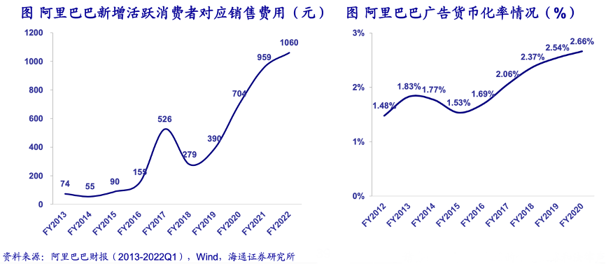 經(jīng)典案例:根據(jù)阿里巴巴財(cái)報(bào)(2013-2022Q1)、wind、海通證券研究所等綜合資訊表明,隨著流量見(jiàn)頂、競(jìng)爭(zhēng)加劇,平臺(tái)獲客成本水漲船高,商家數(shù)和SKU數(shù)量的提升,信息匹配和交易撮合的成本也開(kāi)始提升,阿里巴巴廣告貨幣化率在2015財(cái)年見(jiàn)底后逐步提升,也反映了商家為了產(chǎn)生GMV而需要付出的廣告營(yíng)銷(xiāo)成本在逐步提升。