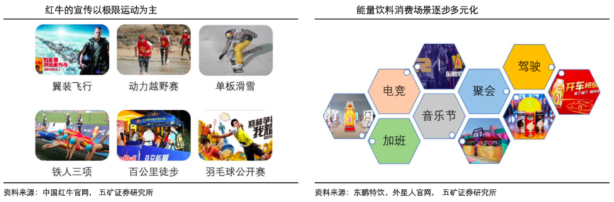 經(jīng)典案例:根據(jù)中國紅牛官網(wǎng)、東鵬特飲、外星人官網(wǎng)、五礦證券研究所等綜合資訊表明,紅牛進(jìn)入中國后宣傳仍以運動場景尤其是極限運動為主,而隨著近年來以東鵬為代表的其他能量飲料入局,商家通過植入廣告、活動贊助等一系列營銷宣傳手段將能量飲料的消費場景逐步拓展至加班、駕駛、聚會甚至電競、音樂節(jié)等其他更加貼近生活的領(lǐng)域。