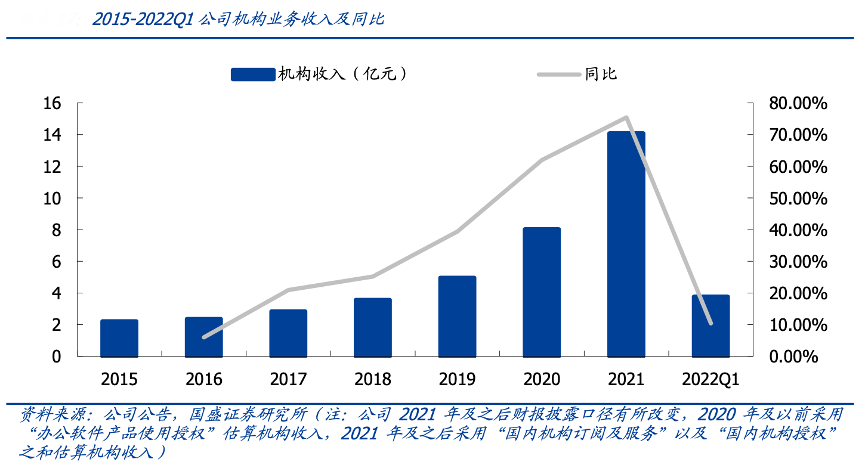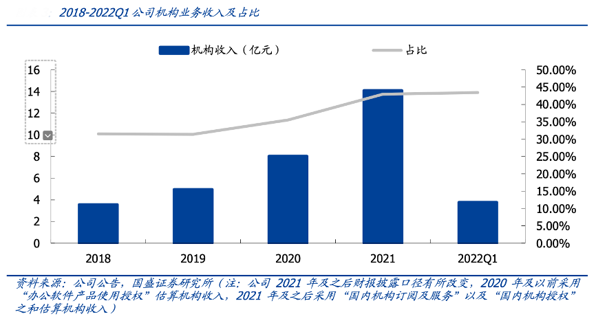 經(jīng)典案例:根據(jù)公司公告、國(guó)盛證券研究所等綜合資訊表明,金山辦公公司機(jī)構(gòu)收入占比不斷提升,2022Q1 達(dá)到 43%。在正版化、信創(chuàng)、云與協(xié)作等多重 因素推動(dòng)下,公司機(jī)構(gòu)占比收入不斷提升。2022Q1,公司國(guó)內(nèi)機(jī)構(gòu)業(yè)務(wù)收入達(dá)到 3.77 億 元,占收入比例達(dá)到 43.43%。