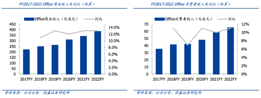 經典案例:根據公司公告、國盛證券研究所等綜合資訊表明,MS Office 已有成熟驗證,B 端收入占比86%。從增速表現而言,B 端收入增速近 5 年來亦持續優于 C 端。FY2022,Office 商業收入同比增長約 13%,其中Office 365 收入同比增長18%;Office 消費者收入同比增長約11%,其中 Microsoft 365 訂閱數達到 5970 萬人,同比增長15%。