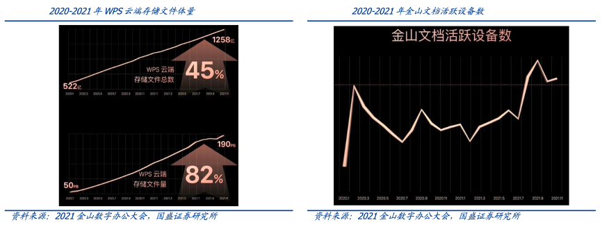 經典案例:根據2021年金山數字辦公大會、國盛證券研究所等綜合資訊表明,云與協作從“嘗新”到“常用”,WPS 完成從工具到服務的轉變。2021年8月起,金山文檔的月活躍用戶數超過了去年2月份時的峰值 2.39 億,達到了一個新的增長起點,表明用戶已經逐漸習慣在日常工作中,大量使用協同文檔來解決協作的問題。