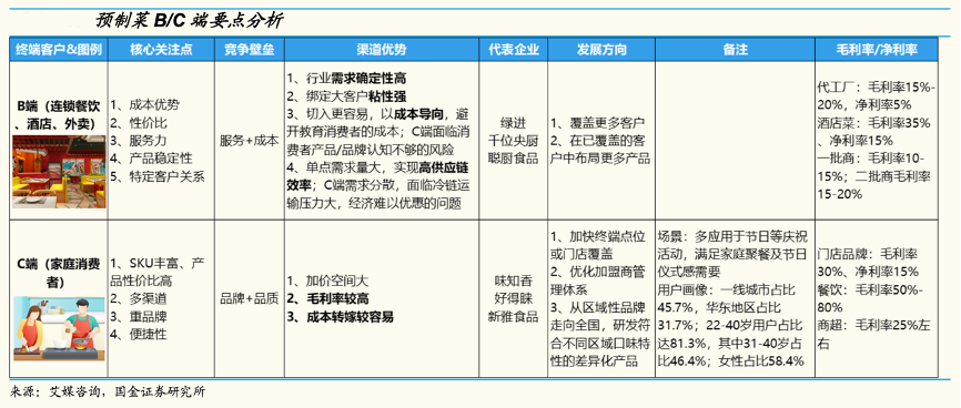 經典案例:根據艾媒咨詢、國金證券研究所等綜合資訊表明,目前預制菜領域B端占比約八成,B 端先行發展起來主因客戶需求較簡單,他們更看重成本因素與供貨穩定性,而 C 端直達消費者,對產品品質、產品豐富度、企業品牌力、渠道布局要求苛刻,企業更難做好;同時餐企降本增效訴求強烈,對預制菜需求確定性更強,C 端仍面臨外賣等競品壓力。
