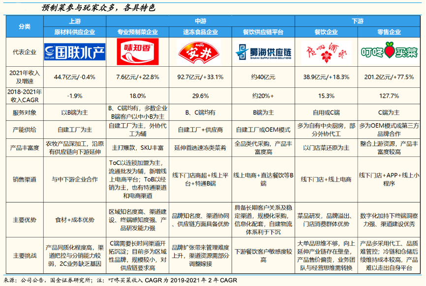 經典案例:根據公司公告、國金證券研究所等綜合資訊表明,短期內 To B 端的中游餐飲供應鏈平臺、上游原材料供應企業優勢明顯,主因獲客成本與運輸成本因原有業務建立的渠道體系存在,新增預制菜業務邊際成本極低,同時上游原材料供應商還具備更強的原材料成本優勢。