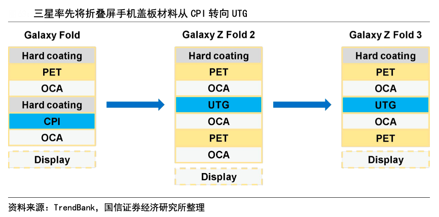 經(jīng)典案例:根據(jù)TrendBank、國信證券經(jīng)濟(jì)研究所等綜合資訊表明,三星在2019年推出的 Galaxy Fold 中使用了CPI 蓋板,后續(xù)在2020年推出的Galaxy Z Flip和Galaxy Z Fold 2開始使用UTG蓋板。2021年12月OPPO發(fā) 布旗下首款折疊屏手機(jī) OPPO Find N,2022 年 4 月 vivo 發(fā)布旗下首款折疊屏手機(jī) vivo X Fold,兩者均采用肖特供應(yīng)的UTG 作為蓋板。
