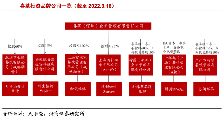 經典案例:根據天眼查、浙商證券研究所等綜合資訊表明,結合喜茶 GO 小程序,喜茶已 布局咖啡、雪糕、甜點烘焙多條產品線,據天眼查數據,2021年 7 月以來,喜茶投資了包括精品咖啡 Seesaw、檸檬茶品牌王檸、水果茶品牌和気桃桃、果汁品牌野萃山、燕麥奶品牌野生植物YePlant、預調酒品牌 WAT 共 6 個品牌,2022 年喜茶又投資了中端價位主打水果茶的蘇閣鮮茶,產品線持續拓展。