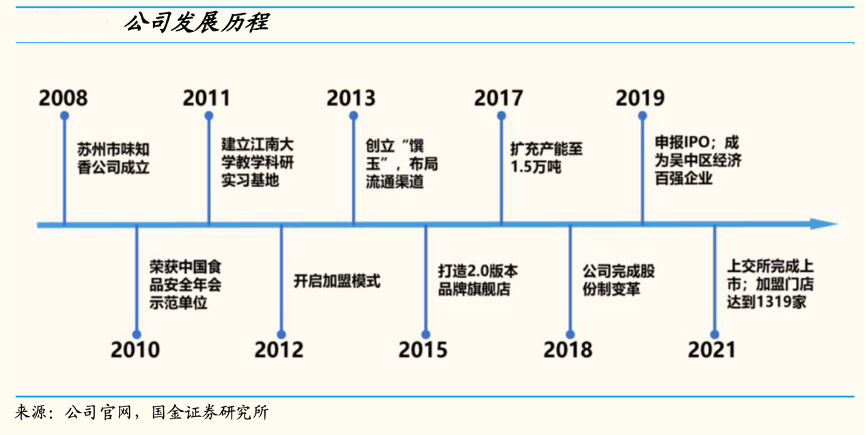 經(jīng)典案例:根據(jù)公司官網(wǎng)、國金證券研究所等綜合資訊表明,味知香公司專注于半成品菜的研發(fā)、生產(chǎn)和銷售,目前為華東區(qū)域性企業(yè)。2012年,公司開放加盟模式 ,此后公司以蘇州為中心,逐步覆蓋業(yè)務(wù)至長三角區(qū)域,在 2021 年 4 月于上交所上市,成為中國預(yù)制菜第一股。