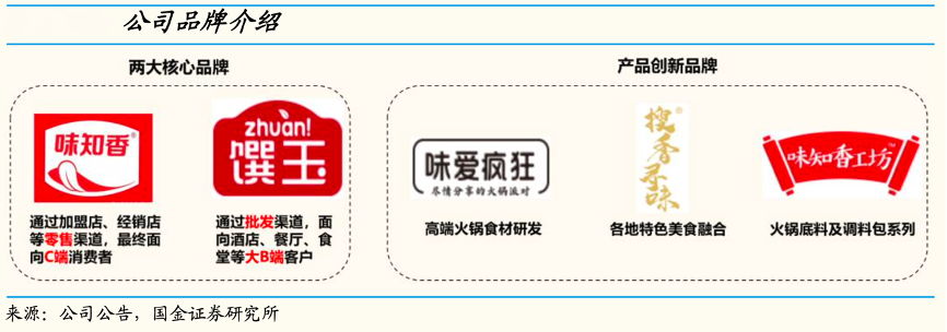 經(jīng)典案例:根據(jù)公司公告、國金證券研究所等綜合資訊表明,味知香兩大核心品牌覆蓋 B/C 端,新設(shè)品牌豐富產(chǎn)品線。公司旗下“味知香”品牌面向 C 端消費(fèi)者,客戶主要為經(jīng)銷店和加盟店,“饌玉”品牌客戶主要從事冷凍食品批發(fā)業(yè)務(wù),面向酒店、餐廳、食堂等 B 端。另外公司還開發(fā)了“味愛瘋狂”,“搜香尋 味”,“味知香工坊” 等新設(shè)品牌系列。