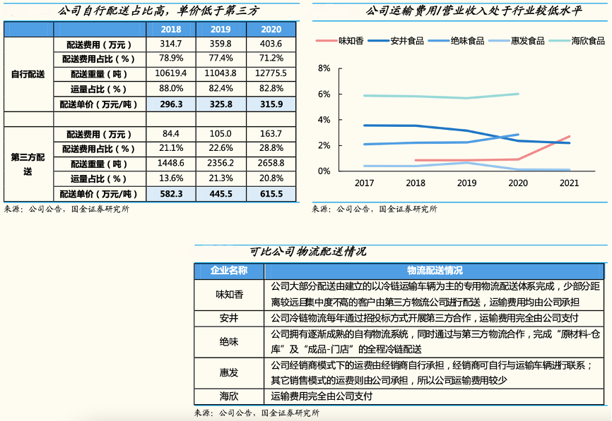 經(jīng)典案例:根據(jù)公司公告、國金證券研究所等綜合資訊表明,味知香公司自建較為完善的冷鏈物流配送體系,目前 80%以上的產(chǎn)品為自行運輸配送,可保障配送途中產(chǎn)品質量與運輸效率。同時公司對華東以外客戶的配送采用與第三方物流合作的方式。目前在上海、浙江、江蘇范圍配送可以做到 2 次/周,合肥地區(qū)配送為 1 次/周。