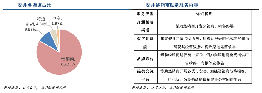 經典案例:根據公司公告、東興證券研究所等綜合資訊表明,安井公司以經銷模式為主, 同時積極布局電商、商超、特通等渠道。其中在流通端,公司一直采取“貼身服務”的模式,幫助經銷商開發分銷商、銷售終端,打造完善的終端網絡,使得公司在渠道中有較強的影響力。