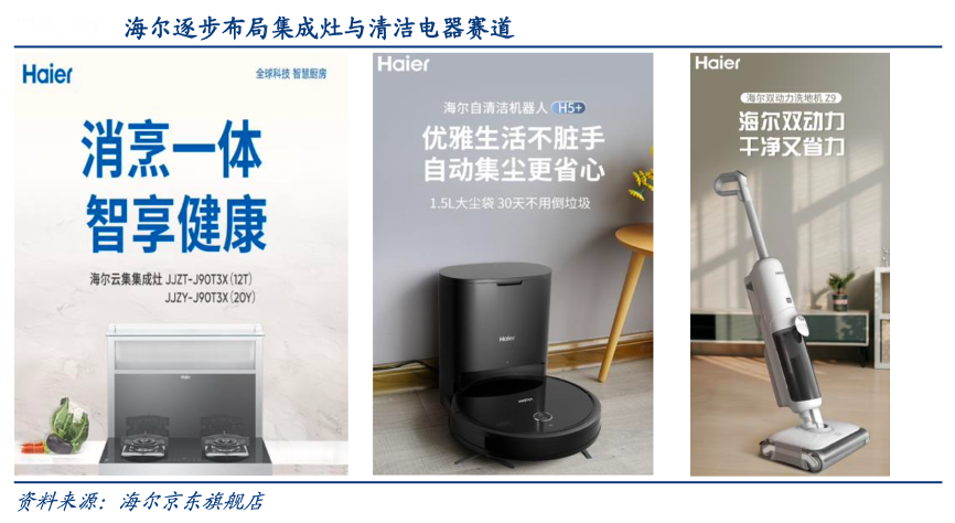 經(jīng)典案例:根據(jù)海爾京東旗艦店、華創(chuàng)證券等綜合資訊表明,2021年12月海爾成立智慧生活家電事業(yè)部,主要用于清潔電器、集成灶與智能家居等品類的研發(fā)推廣,對三翼鳥廚房、客廳等場景進行產(chǎn)品補充。新興生活家電品類與強勢大家電的協(xié)同效應(yīng)不僅能夠完善強化海爾家電全品類的落地能力,同時也將推動三翼鳥場景品牌的進一步擴張。
