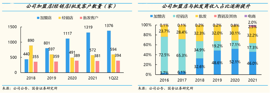 經典案例:根據公司公告、國金證券研究所等綜合資訊表明,味知香零售渠道大力發展加盟店,2021年末公司加盟店達 1319 家,加盟渠道實現收入 3.5 億元/+8.4%,占比達46.0%,加盟店在其市場及周邊特定區域內享受獨家經營的權力,只銷售公司的產品,受公司業務指導和監督。