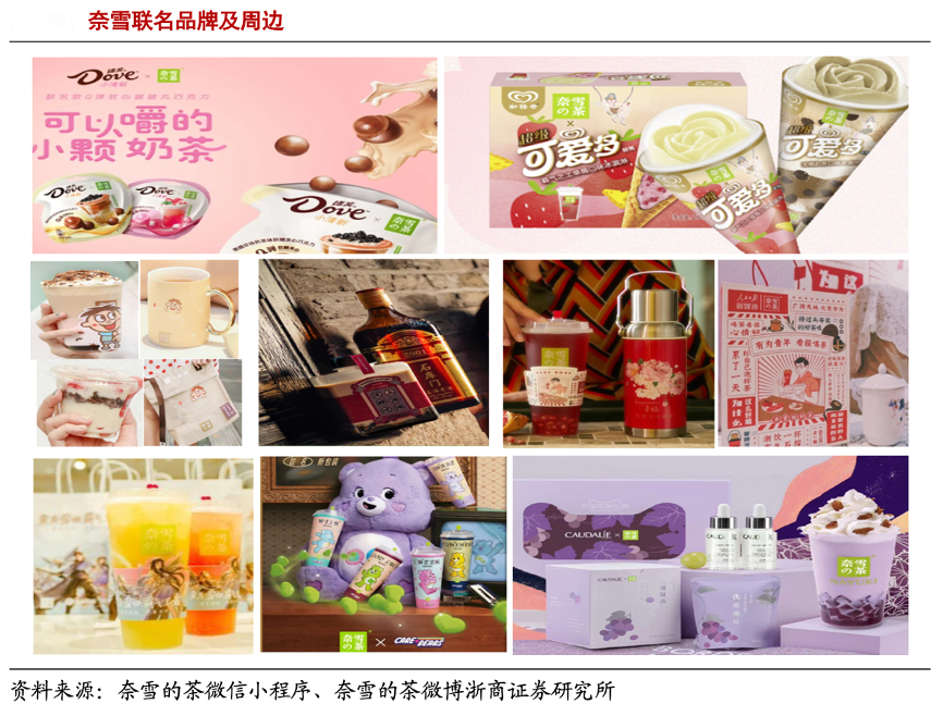 經(jīng)典案例:根據(jù)奈雪的茶微信小程序、奈雪的茶微博、浙商證券研究所等綜合資訊表明,奈雪已與人民日報、王者榮耀、杯子美術(shù)館、亞朵、旺旺等 30 家多行業(yè)多品牌進行聯(lián)名。例如 2019 年 9 月,奈雪的茶聯(lián)名人民日報新媒體開 展“有為青年看包喝茶”活動,開設(shè)線下快閃店還原“爺爺喝的茶”、“爸爸喝的茶”、“我 喝的茶”三個不同年代的喝茶場景。