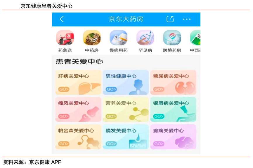 經典案例:根據京東健康APP、中信證券研究部等綜合資訊表明,針對慢病用戶,京東健康建立京東大藥房單病種關愛中心,提供專業的藥學服務,提高人均用藥天數。在保健滋補領域,公司聚焦消費者精細化、專業化的營養攝入需求,打造多樣化的消費場景,如開展“超級品類日”活動,上線健康資訊欄目,開通“問營養師”服務入口等。