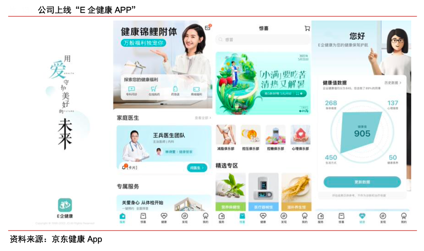 經典案例:根據京東健康APP、中信證券研究部等綜合資訊表明,京東健康上線企業數字化健康管理平臺,通過B2B2C 模式挖掘用戶與業務新增量。2021 年,公司上線企業數字化健康管理平臺“E 企健康 APP”,為企業員工提供全面的醫療健康服務和豐富的產品選擇。