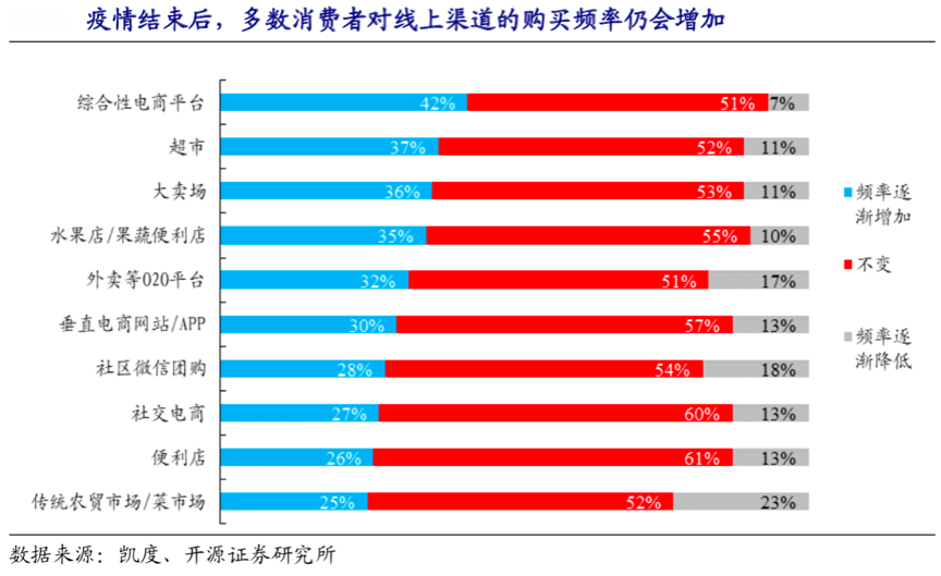 便利性生活消費(fèi)持續(xù)增長(zhǎng),消費(fèi)者對(duì)網(wǎng)絡(luò)生鮮消費(fèi)、便利消費(fèi)等常規(guī)線下生活消費(fèi)的“線上下單接受度”日益提升。根據(jù)凱度、開源證券研究所等綜合資訊表明,疫情結(jié)束后,消費(fèi)者將逐漸恢復(fù)在線下渠道的購(gòu)買頻率,分別有 35% 以上的消費(fèi)者會(huì)更加頻繁地去超市/大賣場(chǎng),而線上渠道的使用頻率預(yù)計(jì)仍會(huì)強(qiáng)勁增長(zhǎng),42%的消費(fèi)者會(huì)增加綜合性電商平臺(tái)使用次數(shù),只有7%的人預(yù)計(jì)會(huì)減少。同時(shí), 外賣等 O2O 平臺(tái)以及社區(qū)微信團(tuán)購(gòu)的使用頻率也將有望持續(xù)增長(zhǎng)。
