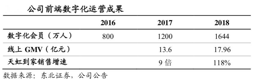 經典案例:據公司公告、東北證券研究所等綜合資訊表明,目前天虹在線上的銷售渠道包括獨立APP、微信公眾號、微信小程序、PC、微品等多個渠道,且會員均全部打通。截至 2018 年底,天虹整體會員人數 1800 萬、數字化會員人數達 1,644 萬,其中 APP 會員人數 840 萬,微信粉絲 645 萬,微信小程序會員 159 萬,消費活躍用戶數占比 87%。2018 年公司的線上交易額達到 18 億,同增 32%