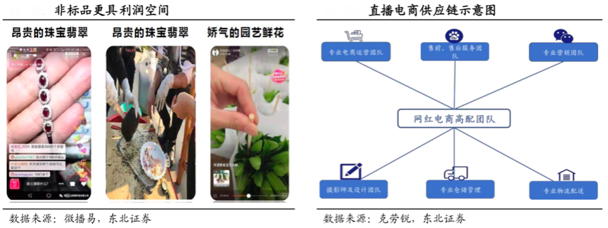 直接電商是前端,強大“供應鏈系統”是重要支撐。“起勢靠流量,成敗看供應鏈”,完善的直播電商需要“專業供應鏈支持”。精選商品,退換貨管理、柔性供應鏈能力、倉儲物流管理等才是增加用戶滿意度,提升轉化率和復購率的核心。標準品以“規模化生產分銷”為導向,側重“以量取勝”,而非標品則以“價值化行銷”為導向,側重“以質取勝”,鎖定高品質消費人群做“圈子營銷”。根據微播易、東北證券 、克勞銳等綜合資訊表明,非標品更具利潤空間,直播電商供應鏈價值突出。