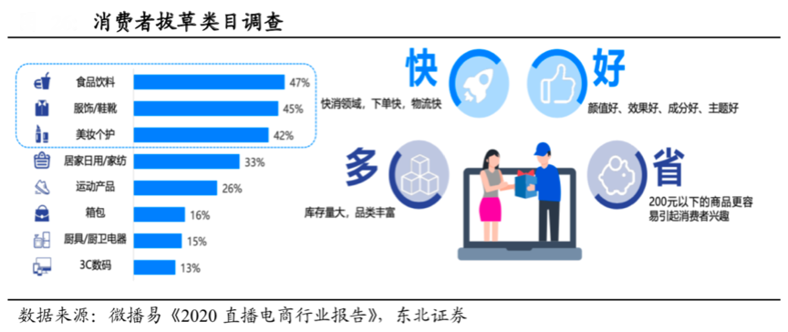 直播電商近兩年內剛剛興起,其有自己的適合品類及適配人群,基于品類特質做“直播商品篩選”,強化產品的高效組合,是直播電商新零售競爭取勝的“不二法則”。根據微播易、東北證券等綜合資訊表明,當前消費者在直播電商中的購物興趣主要集中在快消品上,以食品飲料、服裝、美妝個護等品類為主,核心追求直播電商帶來的性價比。淘寶直播、抖音、快手等主 要電商直播平臺帶貨類目除淘寶擁有如珠寶等基于平臺信用價值、場景價值的客單 類目外,抖音和快手主要品類主要還是集中在性價比高的實用型產品,客單價分為在 0-50 元和 0-200 元區間。